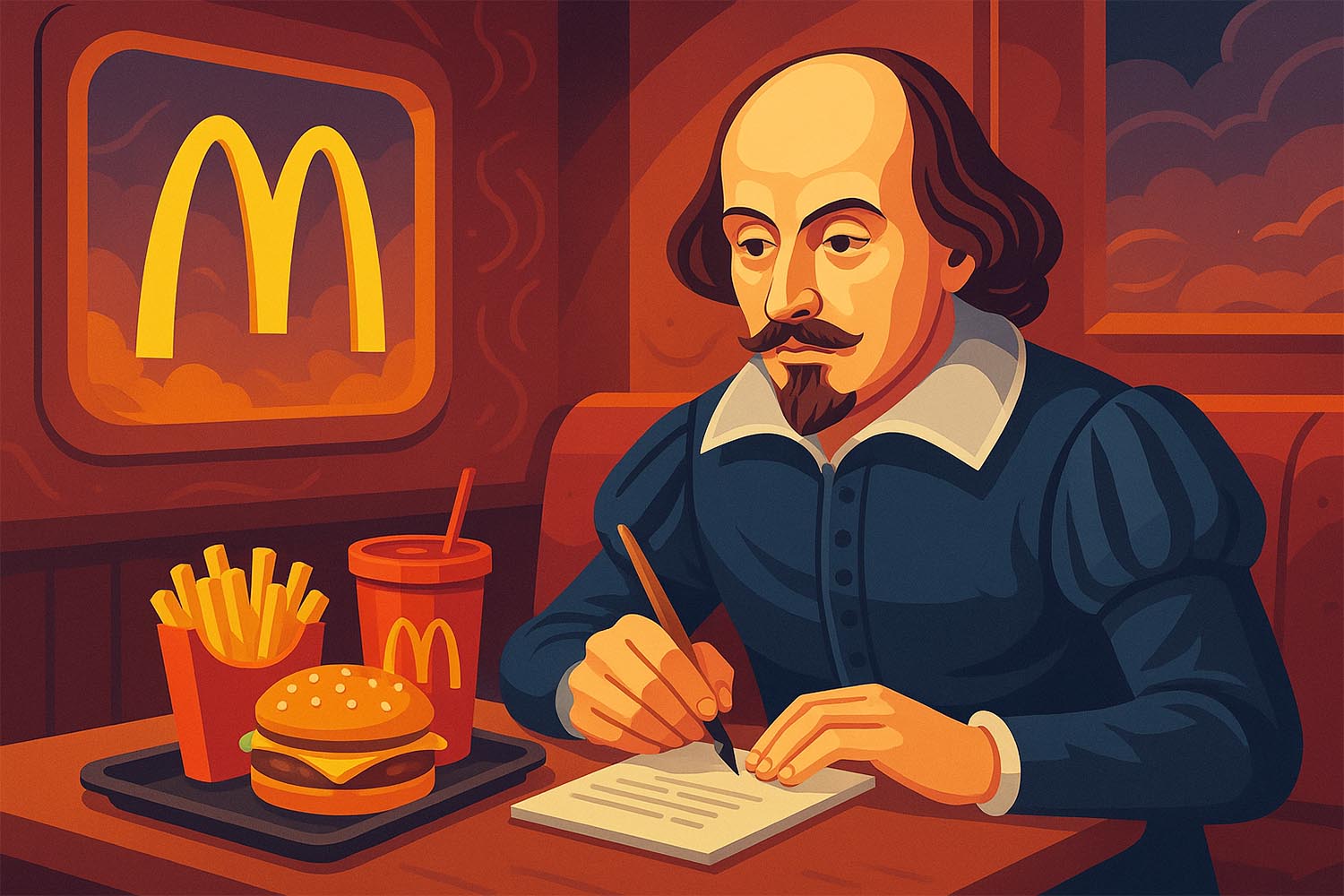 Уявімо на мить, що Вільям Шекспір, великий драматург і поет епохи Відродження, раптово опинився у сучасному світі. Прогулявшись вулицями мегаполіса, він зупинився біля жовтих арок – і вирішив увійти в McDonald’s. Що ж обрав би автор "Гамлета" та "Ромео і Джульєтти", тримаючи в руках пластикове меню? Як смакували б йому картопля фрі та чизбургер? І найголовніше – чи залишив би він сонет у книзі відгуків?