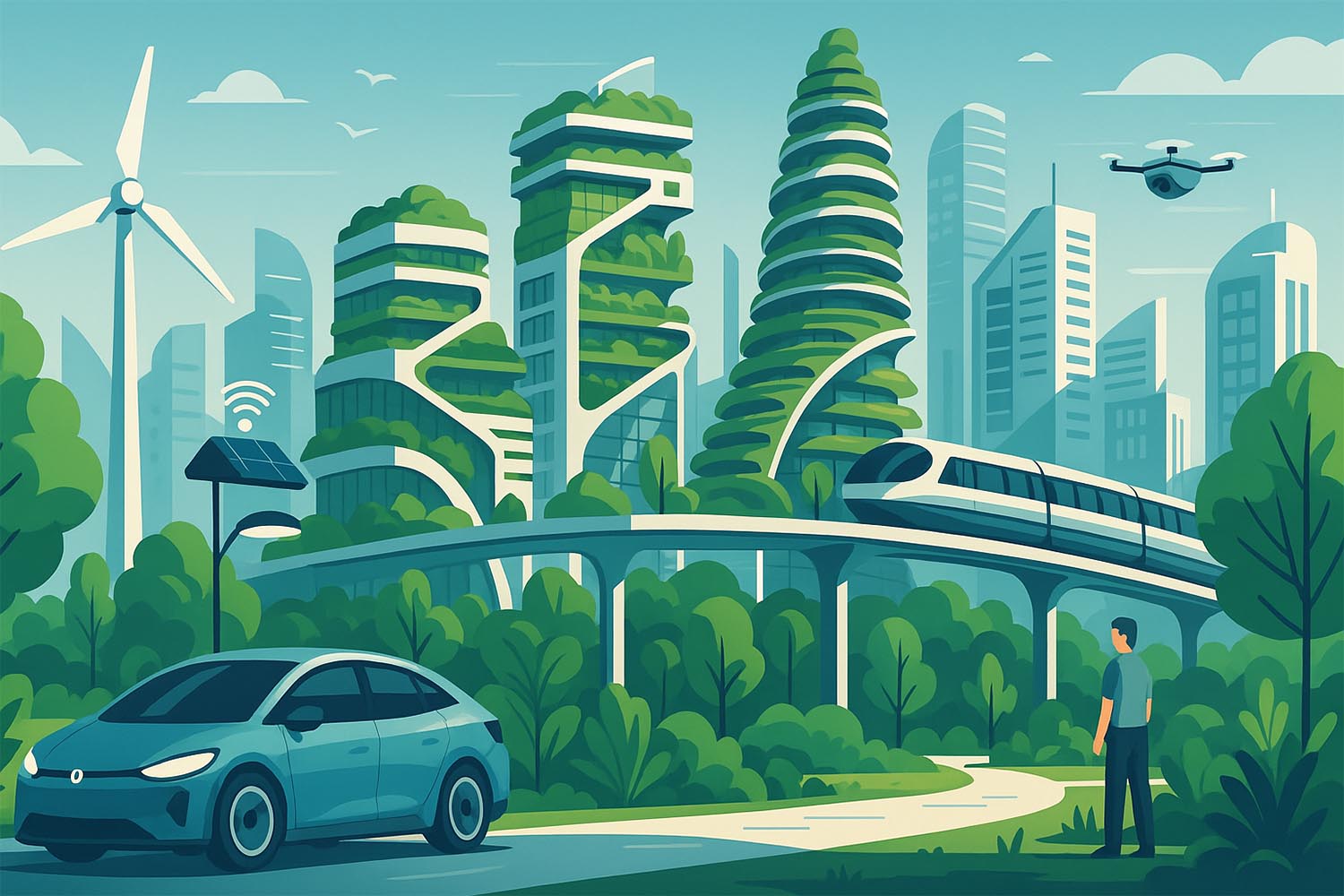 - Екологія понад усе. У 2050 році ідеальне місто – це зелений простір, де природа і технології не суперечать, а співіснують. На дахах будинків – сади та міні-ферми, замість асфальту на тротуарах – охолоджувальне покриття, а кожен парк обладнаний системами збору дощової води. Міста більше не забруднюють повітря – всі автівки електричні або водневі, а більшість людей користується громадським або автономним транспортом.